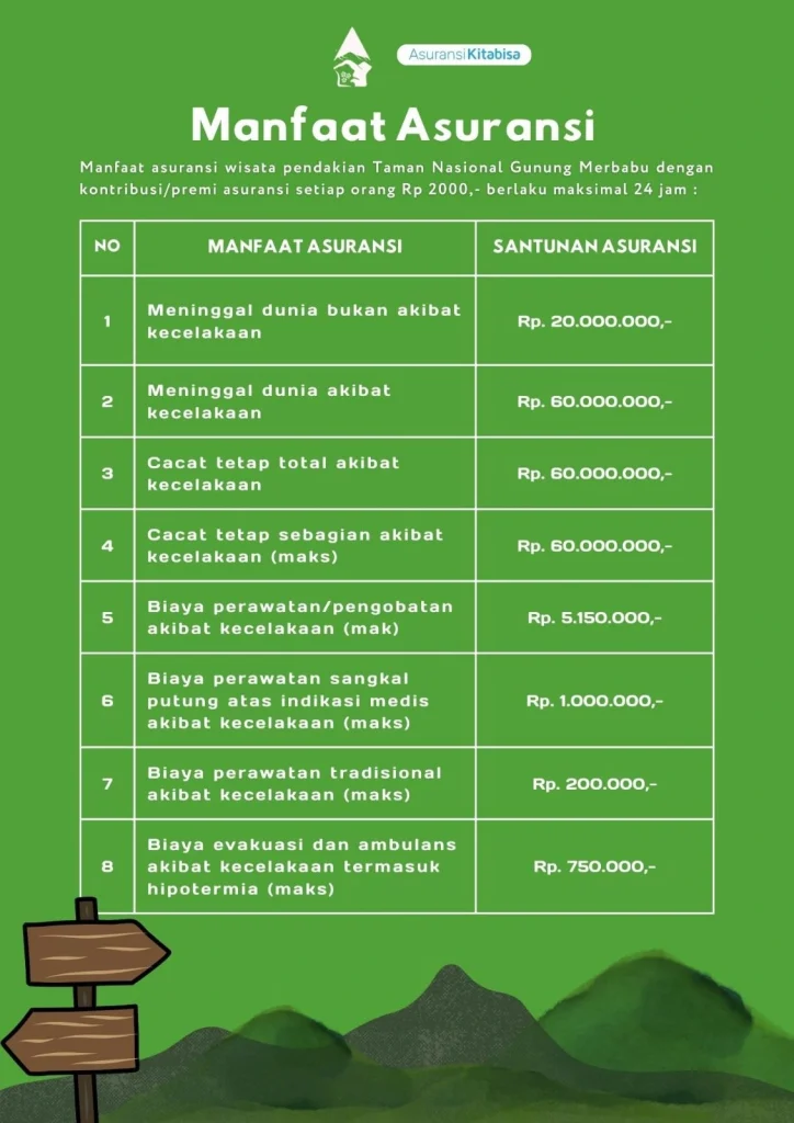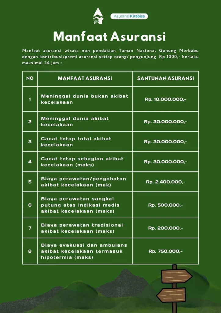 Asuransi pengunjung wisata alam Taman Nasional Gunung Merbabu merupakan kebutuhan penting bagi setiap pengunjung. Selain sebagai syarat administratif di beberapa kawasan, asuransi ini adalah bentuk tanggung jawab pengelola terhadap keselamatan pengunjung.