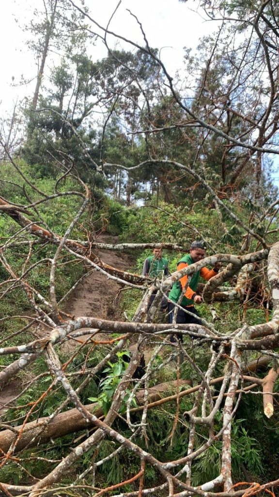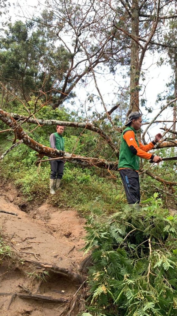 Selain itu, petugas juga melakukan penanganan dua batang pohon tumbang berjenis akasia dengan diameter sekitar 16 cm dan tinggi 9 meter yang menghalangi jalur di sekitar HM 7. Pohon-pohon tersebut telah dipotong dan dipinggirkan agar jalur kembali aman dan nyaman dilalui pendaki.
