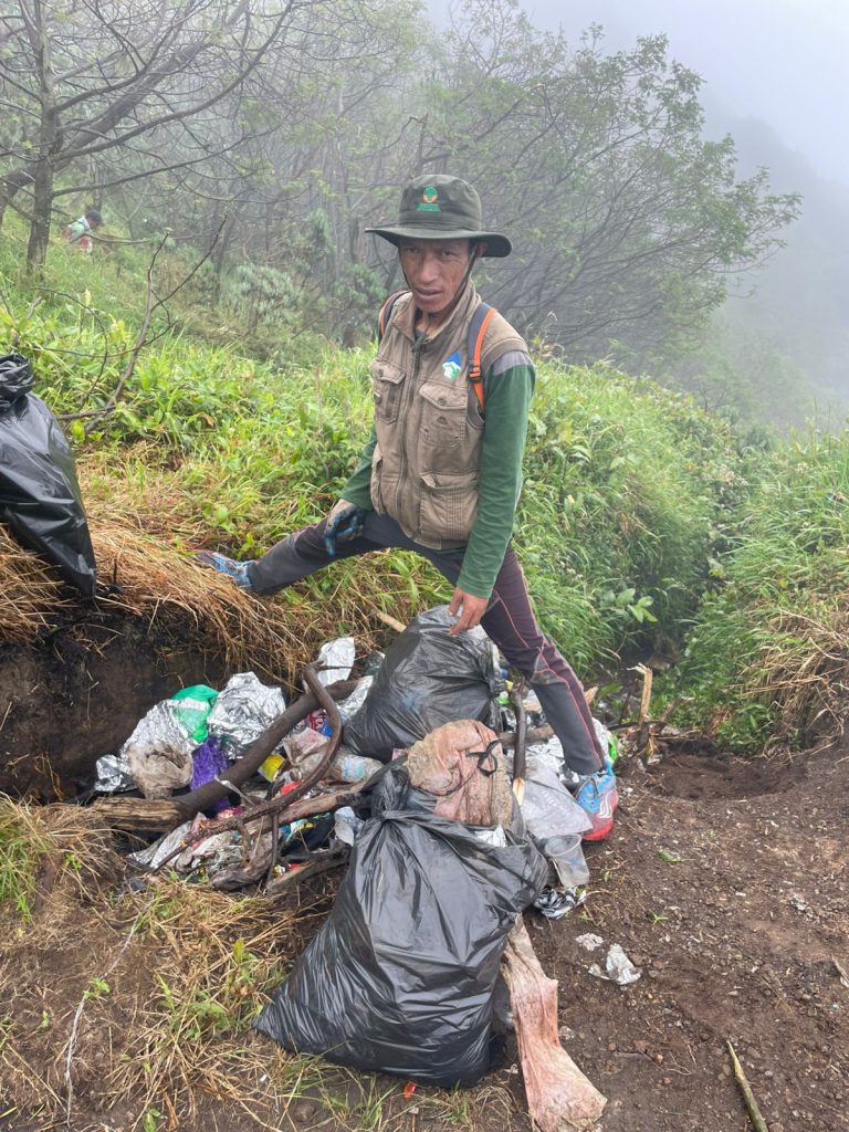 Dari kegiatan tersebut berhasil dikumpulkan sebanyak enam trash bag sampah yang didominasi oleh rain cover, emergency blanket, tisu, botol plastik, serta kemasan makanan. Seluruh sampah kemudian dibawa turun untuk penanganan lebih lanjut.